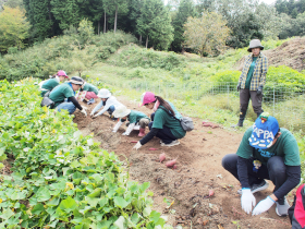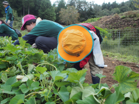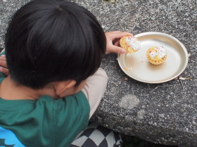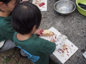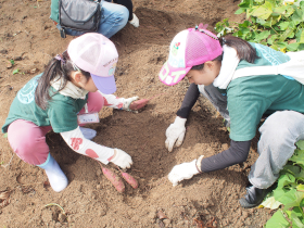 今回は6月に植えたさつまいもの収穫です。まずは,つるを全部引き抜いて土が見えたら,芋を途中で折らないように丁寧に周りの土をのけていき,芋を抜いていきました。少し深いところにもあるかもしれないと,畝をすべて平らにするぐらいまで掘っていきました。芋を使ったおやつ作りにも挑戦しました。